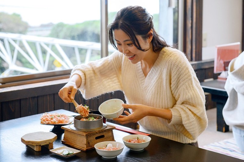 由比(ゆい)駅へ向かう旧東海道沿いの高台に立つ「くらさわや」は、駿河湾名産のサクラエビ料理とともに絶景を楽しめる店。サクラエビの釜めしやかき揚げを堪能した。