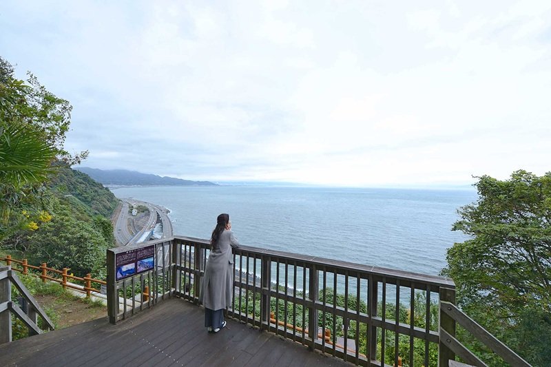 静岡の絶景といえば、やはり富士山は見逃せない。「たびよみリポーター」の田畑英河さんは、続いて静岡市清水区の薩埵峠(さったとうげ)に向かった。歌川広重の浮世絵「東海道五十三次」で知られる絶景ポイント。土砂崩れで通行止めになっていた展望台への遊歩道が2025年1月に復旧した。駐車場から徒歩5分ほどの木製の展望台に上ると、眼下に駿河湾が広がり、晴れていればその向こうに雄大な富士山を望む。