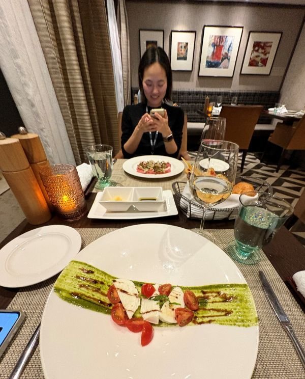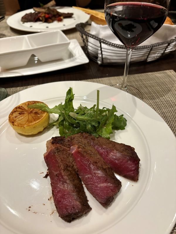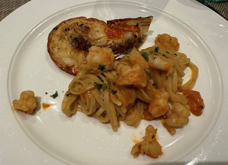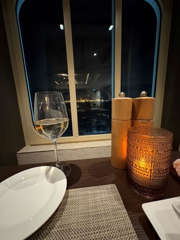 出航後、まもなく夕食へ。初日は予約が取れたイタリアンレストランで、本格的なイタリア料理をワインと一緒に楽しむ。パスタや肉料理を食べながら、グラスが空になりそうなころにすすっとボトルが差し出される。にっこり笑顔で「おすすめです」と言われると断れない(言い訳)。う~ん、ペースを考えなきゃ。