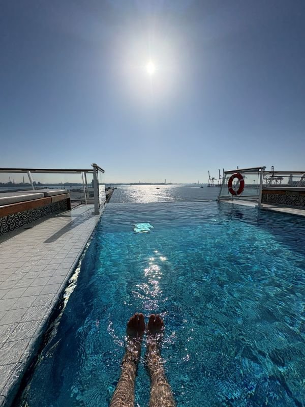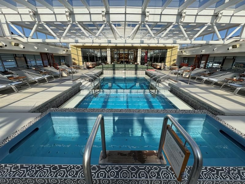 船にはプールが二つある。プールサイドでアイスカフェラテを飲んで一休みしてから後方のデッキにあるもう一つの屋外プールにも行ってみた。冬場で寒いかと思ったが、天気も良く温水プールは気持ちいい。いわゆるインフィニティプールで、海にそのままつながっているような気分もいい。