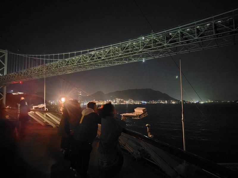昼間、ゆったり過ごしたためか、夜は目がさえ気味。ラウンジをうろうろした後、そろそろ関門海峡だな、とデッキに出ると大勢の乗客。皆さん見所はちゃんとチェックしてますね。思ったよりずっと狭い海峡。両岸の町明かりを眺め、関門橋の下をくぐりながら、写真を撮って過ごした。