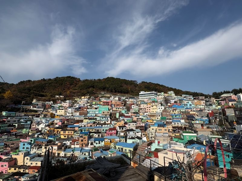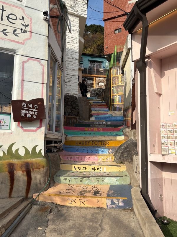 実は韓国訪問は初めて。言葉もわからないので、ガイド付きはありがたい。甘川文化村は山肌に広がる家がそれぞれ鮮やかな色で彩られ、街全体がアートのような不思議な空間となっている。路地が迷路のように走る町中にはおしゃれなカフェなどもあり、観光客でにぎわう。しかし、もともと朝鮮戦争から逃れた人々が移り住んだ貧しい地区だったそうで、ガイドの説明で歴史を知ると、風景も少し変わって見える。