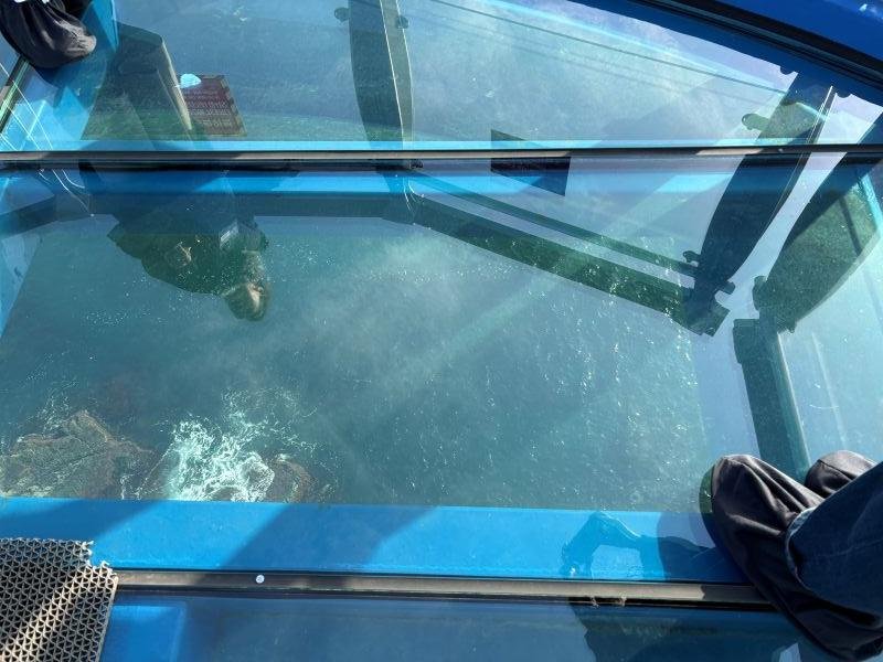 その後、五六島に移動し、海にぽつぽつと並ぶ島々を見学。海にせり出したスカイウォークは眺めが最高だが、床がガラス製で、足元はるか下に海が見えてちょっと怖い。床を傷つけないように靴にカバーを付けるのだが、「傷がついたらどうなるのか?」と考えると、歩き方も恐る恐る……。
