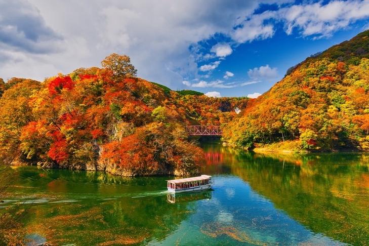 【写真】札幌へ行くならぜひ泊まりたい定山渓温泉。定山渓大橋から紅葉に包まれる温泉街を望む